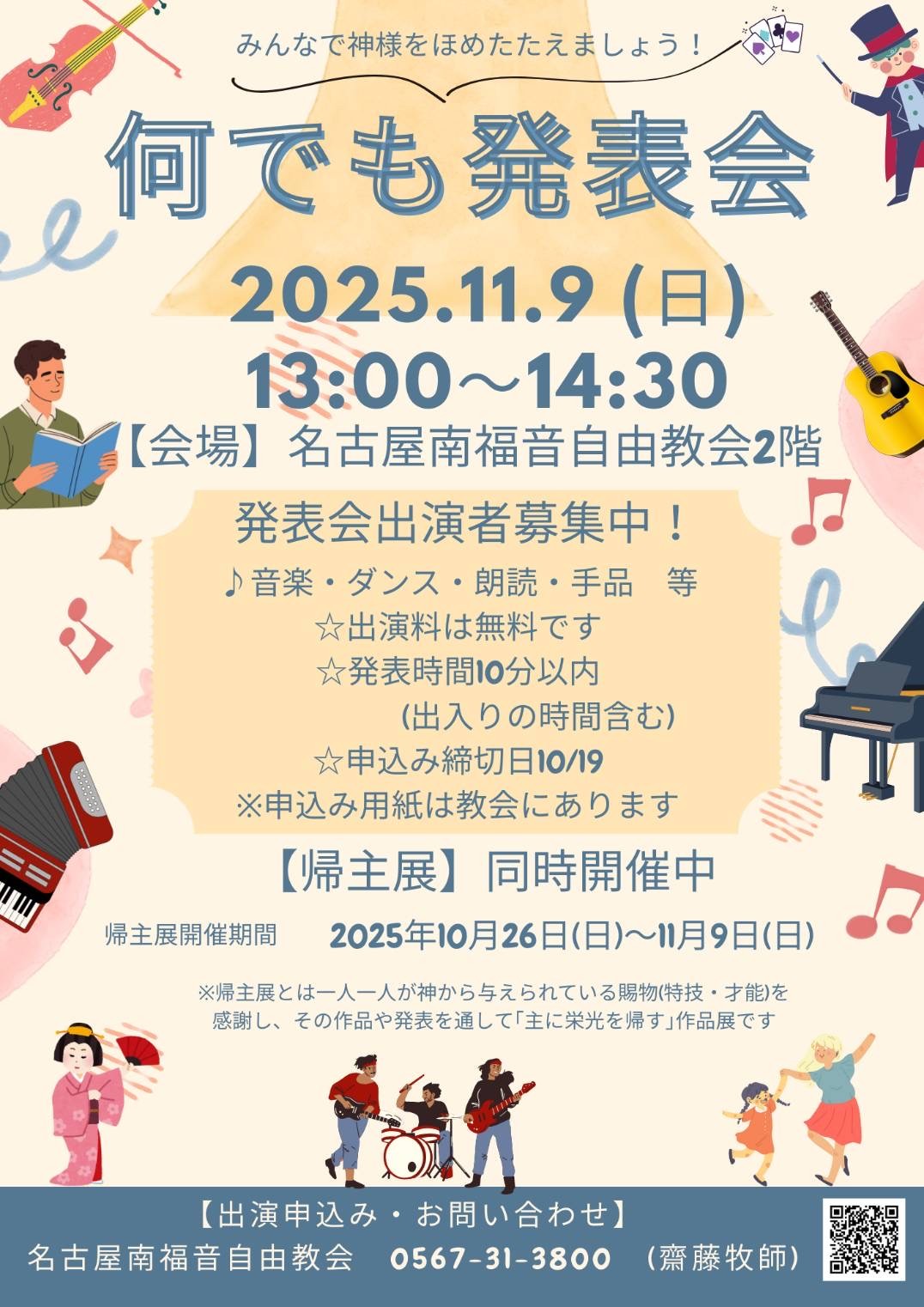 暑い夏が終わり、秋風が心地よい季節となりました。今年も帰主展(作品展)に併せて、何でも発表会を開催します。只今出演者を募集しております。是非、この機会に皆様の良き賜物をお披露しませんか?ご応募お待ちしております!